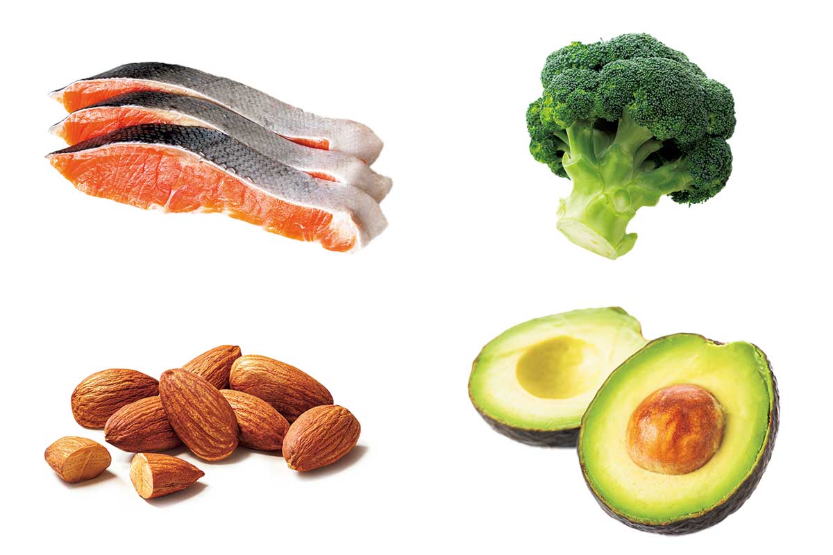 (左上から時計回りに)鮭、ブロッコリー、アボカド、アーモンド
