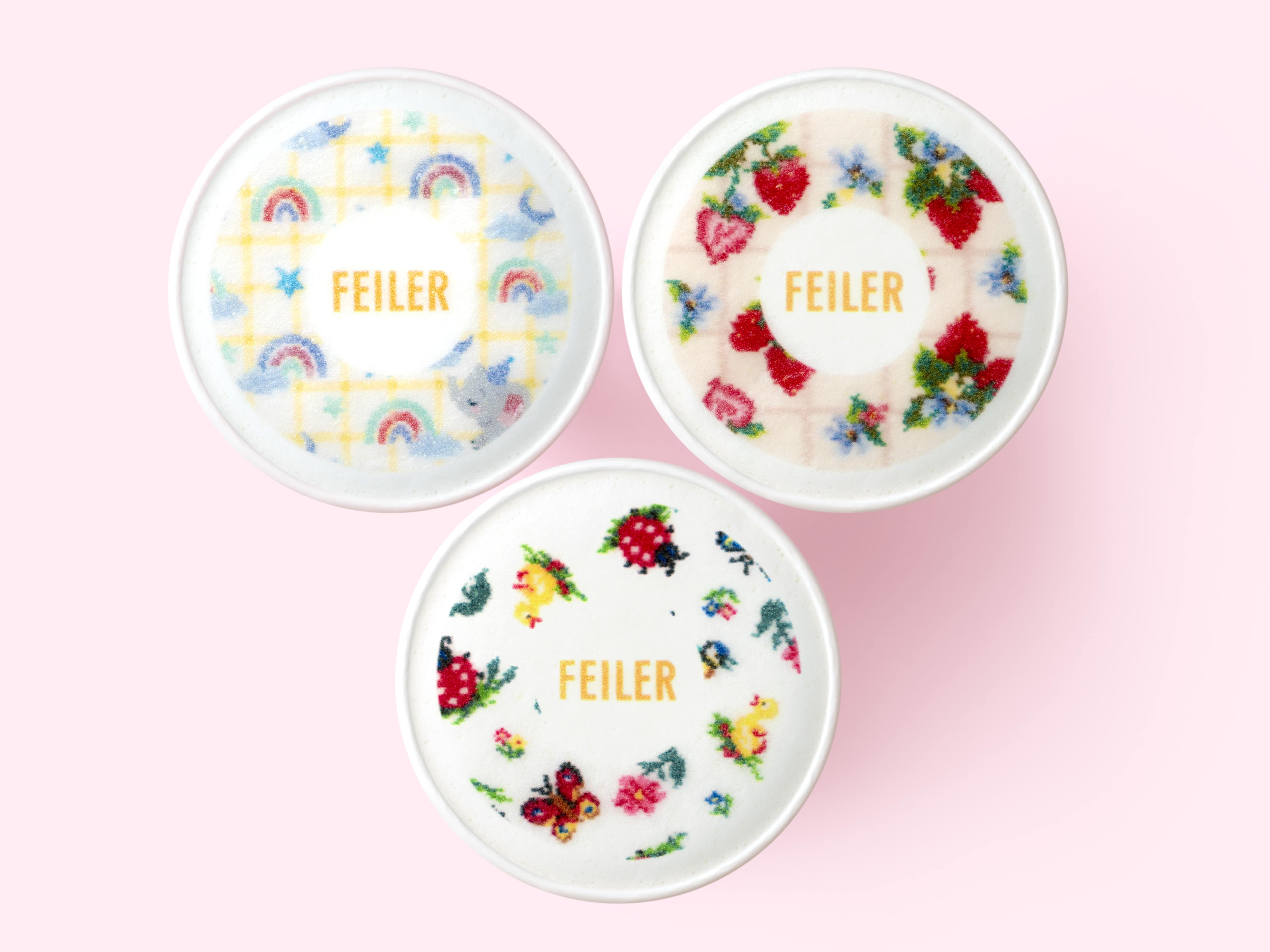 さらに、会場内のカフェでは、作品鑑賞の余韻とともに、「FEILER ART(フェイラーアート)」の世界観に浸るひとときをお過ごしいただけます。フェイラーアプリダウンロード&フェイラーメンバーズ会員登録のうえ、商品お買い上げの方には、本イベント限定の「フェイラー」のデザインをあしらった、ビジュアルでも楽しめる“飲めるアート”をお一人様一杯プレゼントいたします。ドリンクはカフェラテ、デザインは3種類『ハイジ』、『ストロベリーフィールドプティ』、『トゥインクルトゥインクル』の中からお選びいただけます。なくなり次第終了いたします。