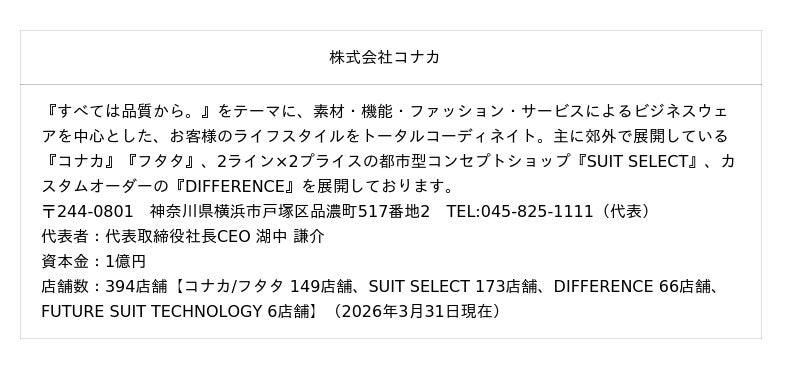 株式会社コナカでは、お客様の利便性と接客サービスの向上により、さらにショッピングを楽しんでいただけるよう今後も取り組んでまいります。