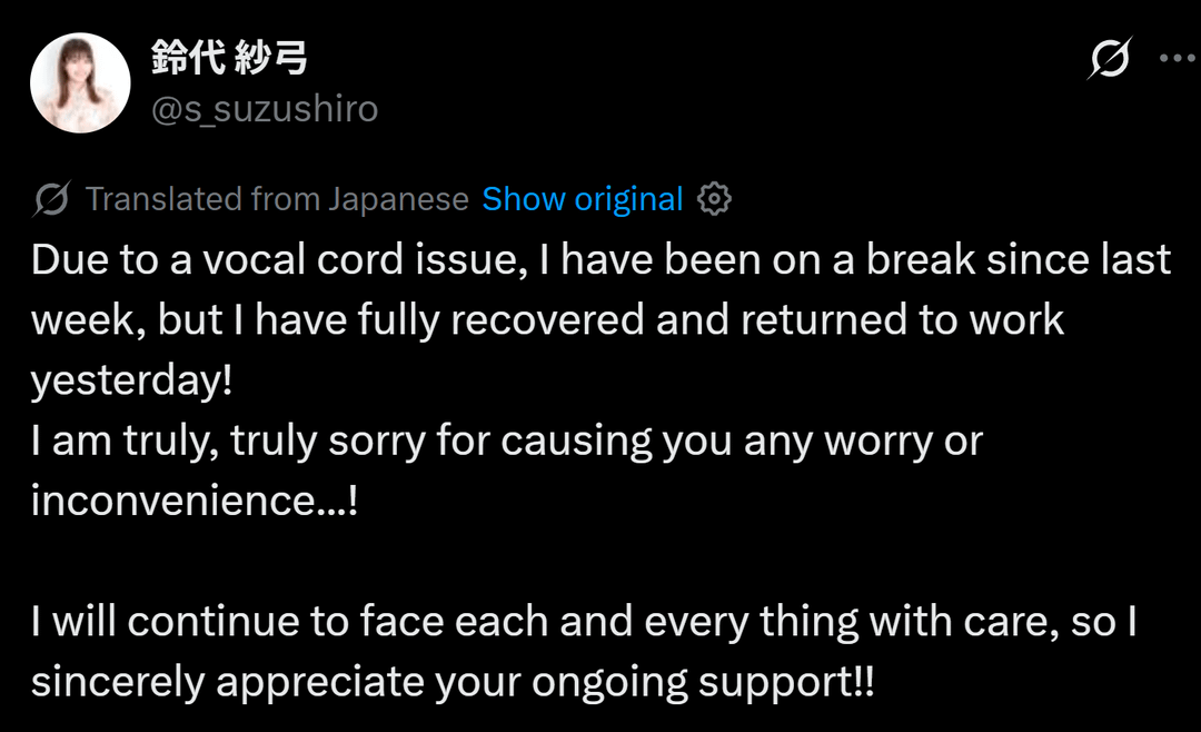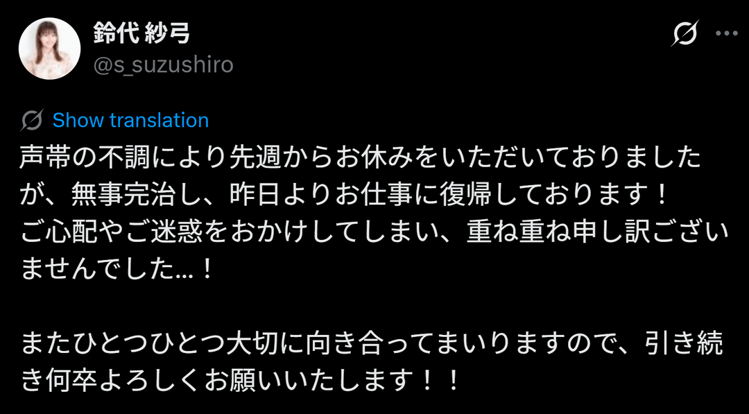 鈴代紗弓、声帯疾患から回復し仕事復帰