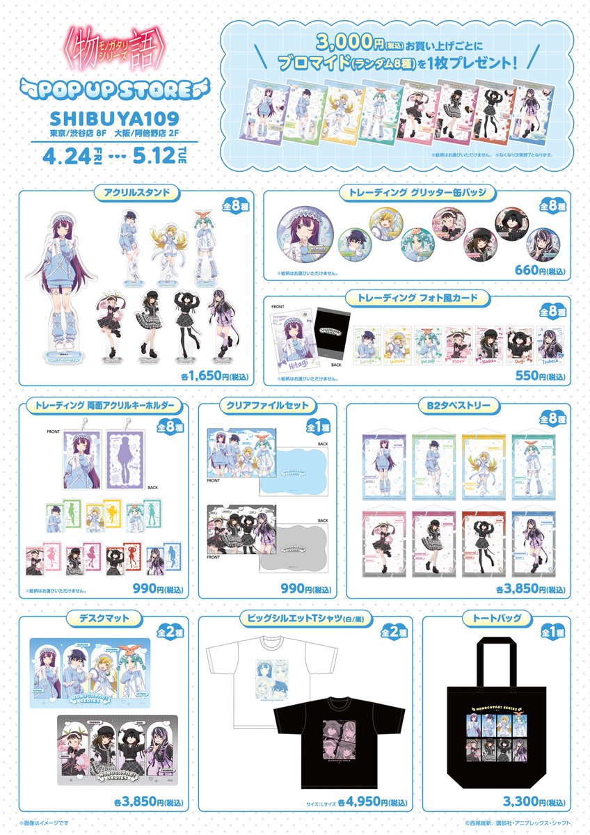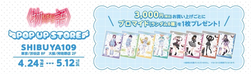 「物語シリーズ」ポップアップストアにて、グッズをお買い上げ3,000円(税込)毎に特典として「ブロマイド 全8種」がランダムに1枚プレゼントされる。