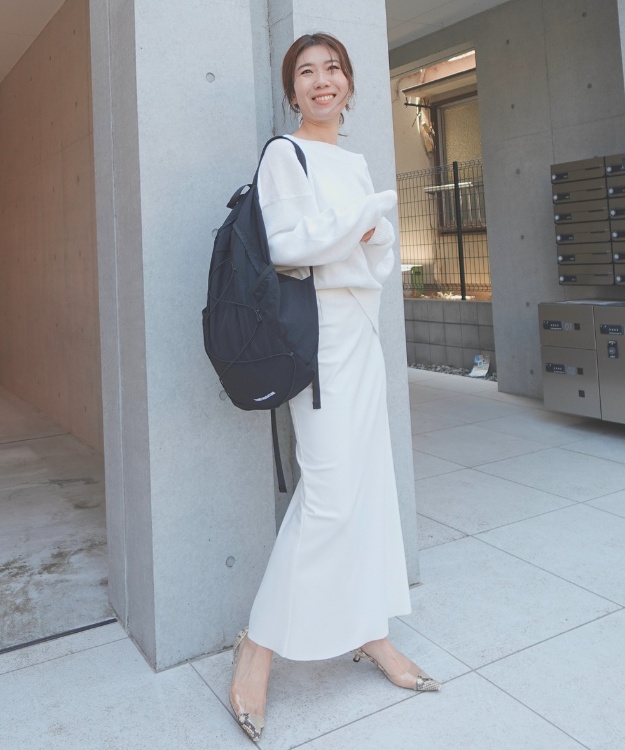 黒リュックは、コーディネートの引き締め役と捉えています。ボリュームのあるスカートや、白のワントーンに合わせると、全体がぐっと締まります!