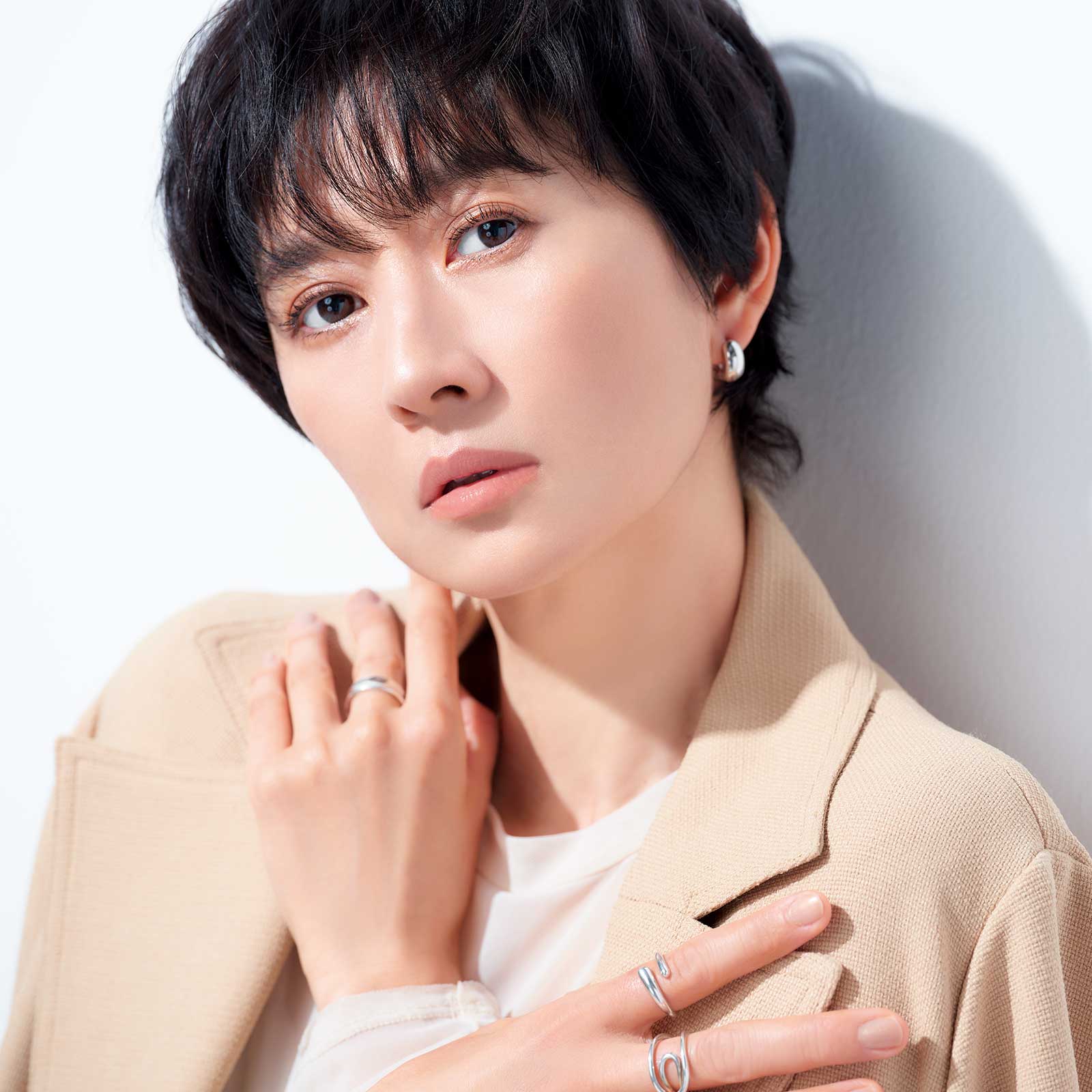 ジャケット¥33,000(PUBLIC TOKYO/PUBLIC TOKYO カスタマーサポート) ピアス¥31,900(ウノアエレ/ウノアエレ ジャパン) リング[右、人差し指]¥16,060 リング[左]¥14,300〈ともにAYAKA jewelry〉リング[右、中指]¥9,900〈YArKA〉(すべてロードス) シアートップス、スタイリスト私物