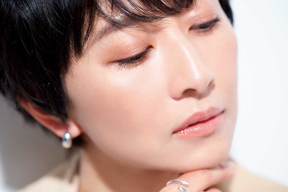 マットな質感だと老け見えしがちなため、肌はしっとり薄膜のツヤ肌に。知的で凛とした印象が叶います。シャドウは、ラメ入りでほのかに黄みのあるベージュ、リップは彩度高めを選ぶとくすまず、統一感と透明感が。チークは上からハイライトをのせることでフレッシュ感をプラス。