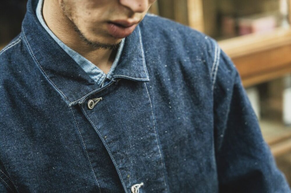 「これは弊社で働く職人のために作れられたBSCユニフォーム。快適に仕事をするためのパターンであることは言わずもがな、耐久性や長く使い、汚れたり、破れて修理しても愛着が湧くようなものづくりを目指しています。例えばこのカバーオールは座って作業することがメインなので、もたつかないショート丈かつ動きやすいライトオンスのデニムになっています。またカバーオールと言えば、4つポケットが代表的ですが、ポケットに収納する道具は少ないのでミニマルな2つポケットに。普段の洋服と違って、汚れなどはまったく気にしませんし、普通に洗濯するのでエイジングもかなり早いんです(笑)。実力派ブランドであるオールドジョーに依頼しているので、ファッションとしても優秀な自慢のユニフォームです」