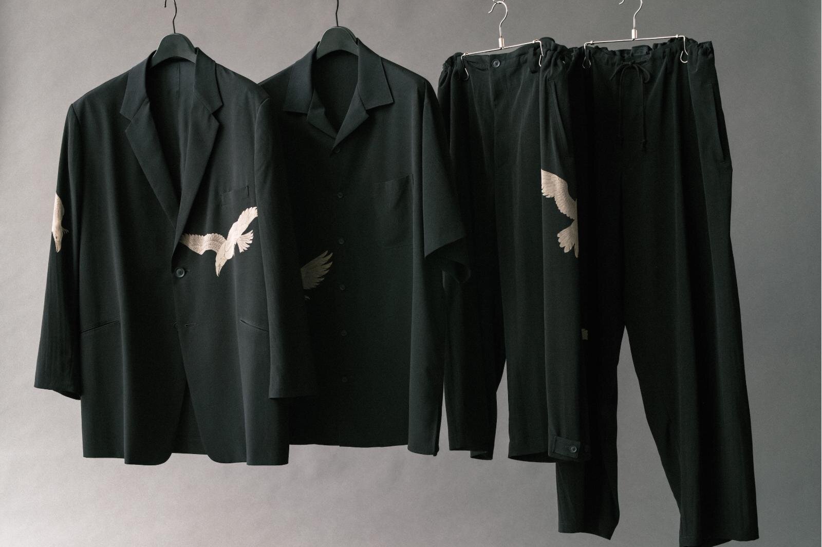 「カラス」の抜染プリントウェア ヨウジヤマモト“羽ばたくカラス”のメンズジャケットやパンツ、タキシード生地に抜染プリント|写真1
