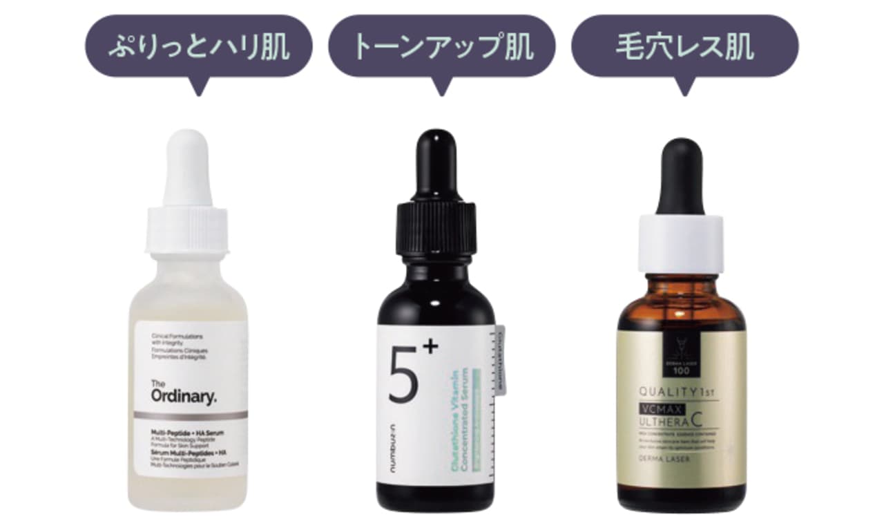 どんな肌になりたいかゴールを決めて、それが例えばハリのある明るい肌だったら、ハリと明るさの優先順位も決める。その優先順で、効果が期待できる美容液を取り入れてみて