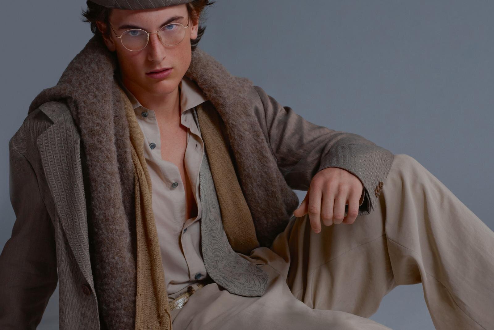 1979年春夏シーズンのウィメンズルックを参照したジャケットは、ショート丈のシングルブレストタイプ。上品さと深みを醸すメランジ調アルパカ混紡ウールの表地は、ヘーゼルナッツブラウンとサンドベージュでやわらかな表情に仕上げた。裏地には肌なじみのいいヘーゼルナッツブラウンのシルクを用いている。