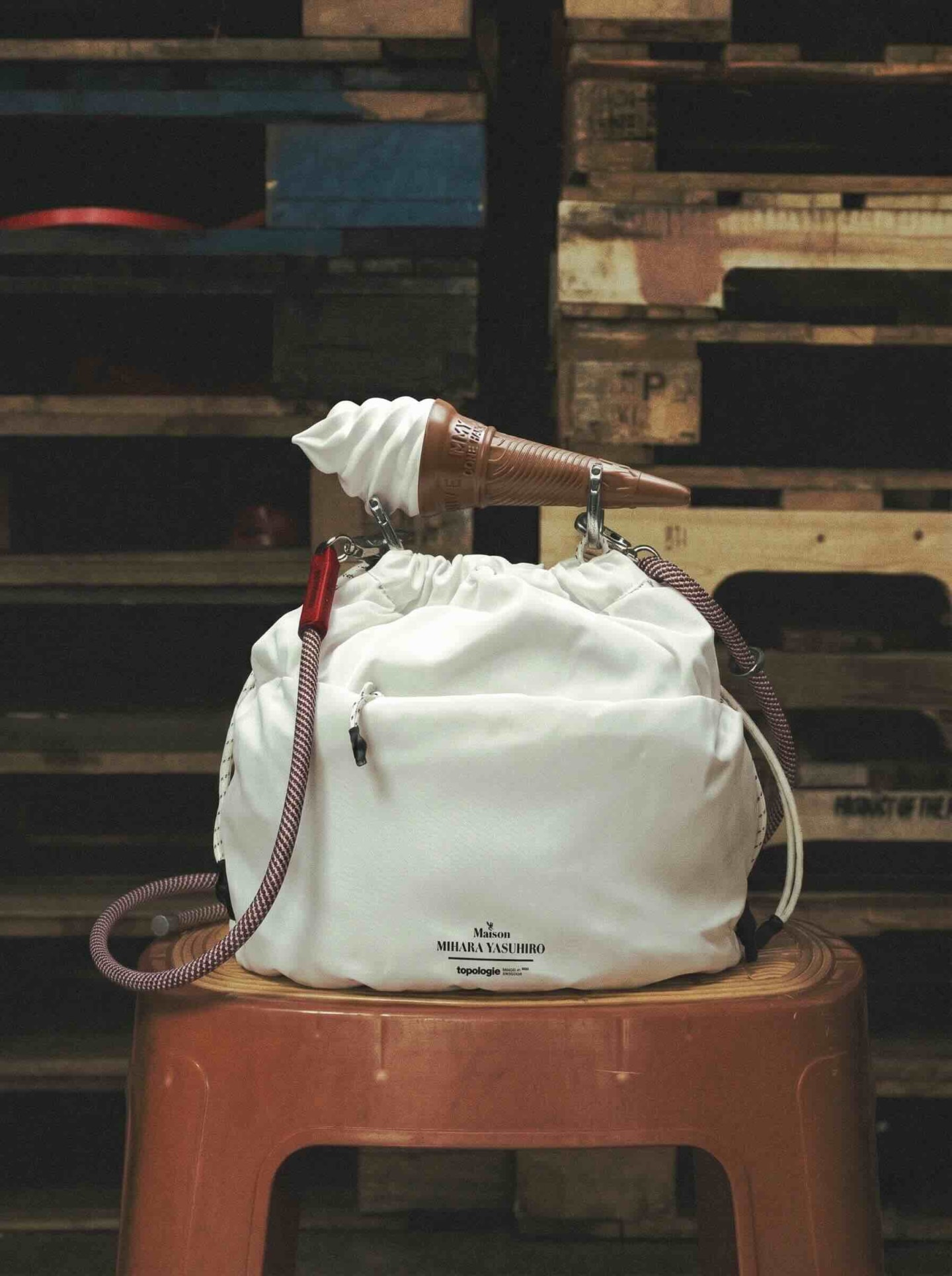 本コレクションでは、topologieならではの機能性とカスタマイズ性をベースに、「Bottle Sacoche」や「Reversible Bucket」といった定番モデルを再構築。Maison MIHARA YASUHIROのアクセサリーラインで印象的な、バナナやソフトクリーム、歯磨き粉といったユニークなモチーフや、ボリューム感のあるフォルムを取り入れている。