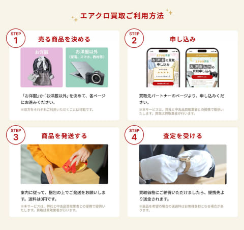 エアクロ買取では、リユース大手のトレジャー・ファクトリーとマーケットエンタープライズと連携。衣類に加え、家電や雑貨など幅広い品目の買取に対応する。