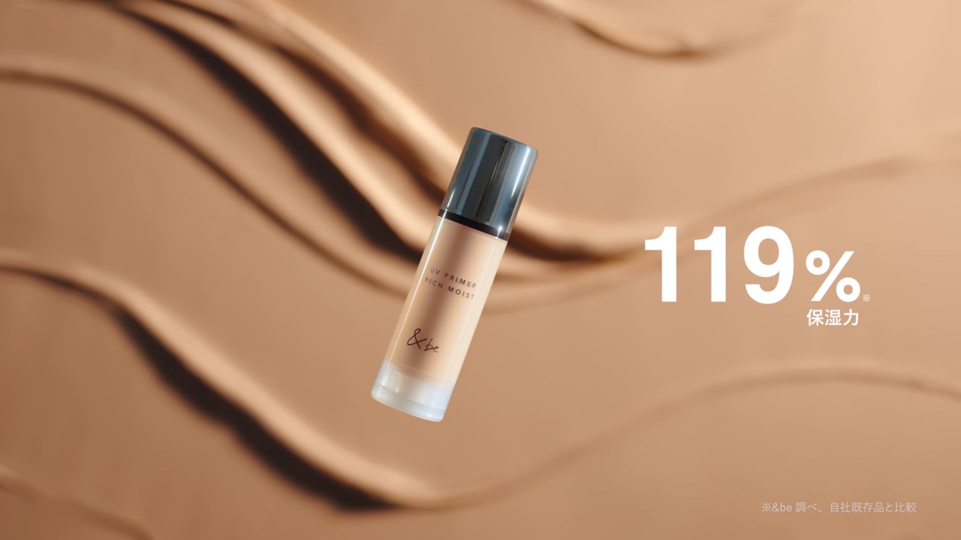 本CMでは、佐久間の「ベースメイクはUVプライマー」という印象的なセリフを起点に、美容液クリーム下地“&be UVプライマーリッチモイスト”の魅力を描いている。乾燥を感じさせないツヤ肌とクールな表情を見せる佐久間と、“&be UVプライマーリッチモイスト”がリズムよく切り替わりながら展開し、うるおいに満ちた“プロクオリティの輝く肌”を印象づけている。