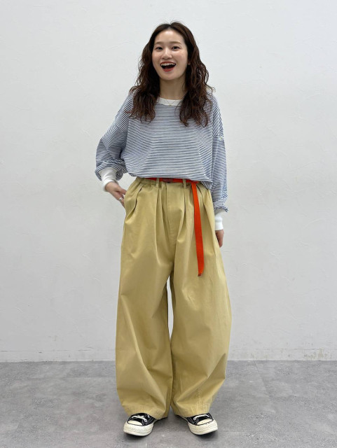 ドロップショルダーのゆるっとしたシルエットが魅力のボーダーTシャツ。腰にかかる程度の長めの丈感で、自然と体型カバーも叶えてくれます。首元と袖口は配色になっているのがシャレ感を後押しするポイント。スタッフのomeguさんは「袖のボリューム感や首の抜け感が女性らしさもあり可愛い!」とお気に入りの様子。