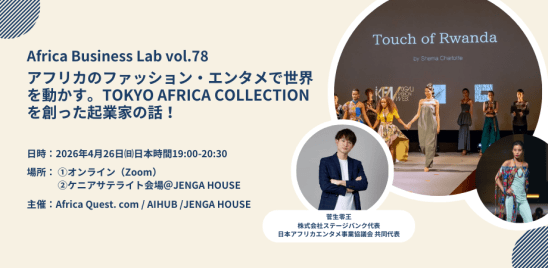 一般社団法人アフリカクエストは、2026年4月26日(日)に「第78回アフリカビジネスラボ〜アフリカのファッション・エンタメで世界を動かす。Tokyo Africa Collectionを創った起業家の話!〜」をオンラインとケニアサテライト会場のハイブリッドで開催します。