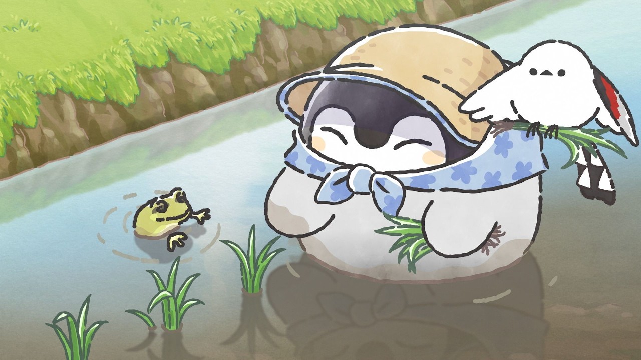 アデリーさんと一緒に田植えをするコウペンちゃんと邪エナガさん