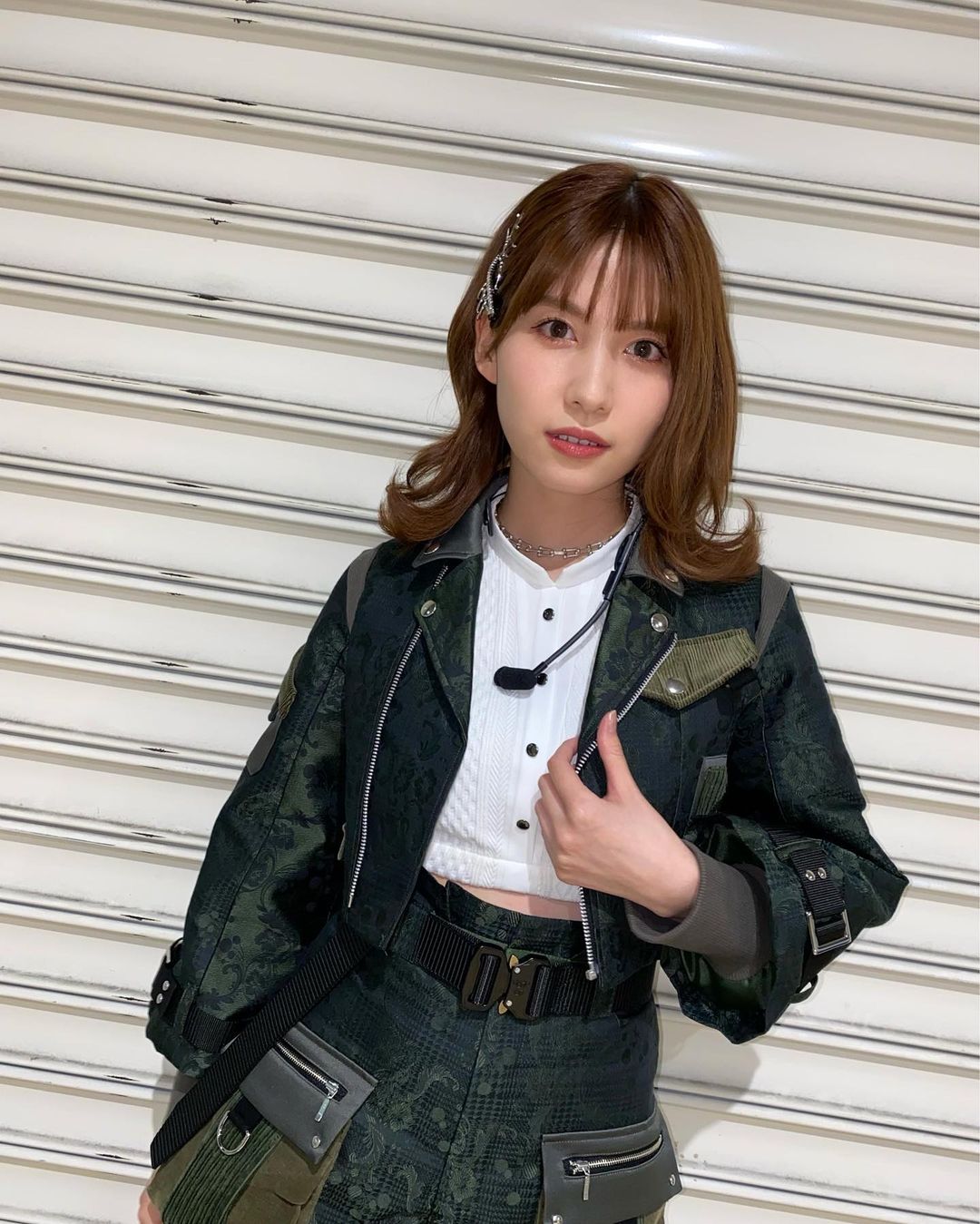 #根も葉もRumor 近くでみると生地がお洒落でめちゃくちゃ可愛いんです カーキ系でも深めな感じの色味が絶妙で、カジュアルなんだけど上品な感じが好みすぎました、、 お腹がチラッとみえる丈感とかチェーンのネックレス、ピン留め沢山つけたり今どきですよね🤦♀️🖤 素敵な衣装を作っていただけて感謝感謝です…✨ #AKB48 #オサレカンパニー #megu_taniguchiakb48Megu TaniguchiTaniguchi Meguオサレカンパニー根も葉もRumor谷口めぐ
