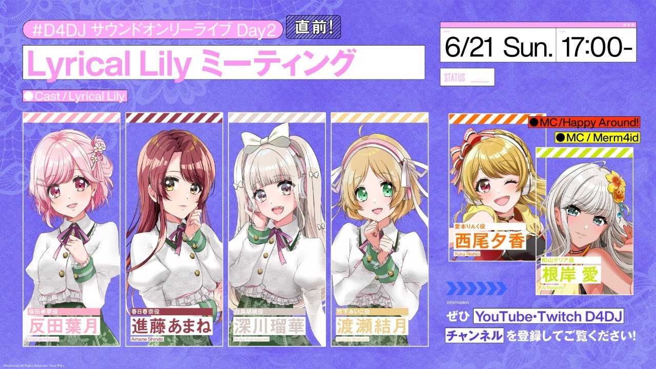 6月21日(日)に、キャラクターが出演する“音声のみ”の無料配信ライブ「D4DJ Sound Only Live」の配信を記念して、出演キャストによる「#D4DJサウンドオンリーライブDay2 直前!Lyrical Lilyミーティング」をYouTube「D4DJチャンネル」にて生放送!