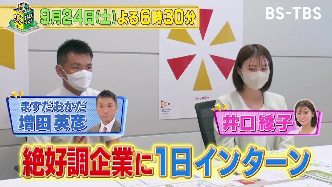 「御社でインターンよろしいでしょうか?」9/24(土)よる6時30分は…タレントの井口綾子が、運用資産額23兆円超えの資産運用のプロ「大和アセットマネジメント」で1日インターン!ますだおかだの増田英彦が見守る中、様々な部署の社員に交じってお仕事体験!投資を成功に導く舞台裏が明らかに!?