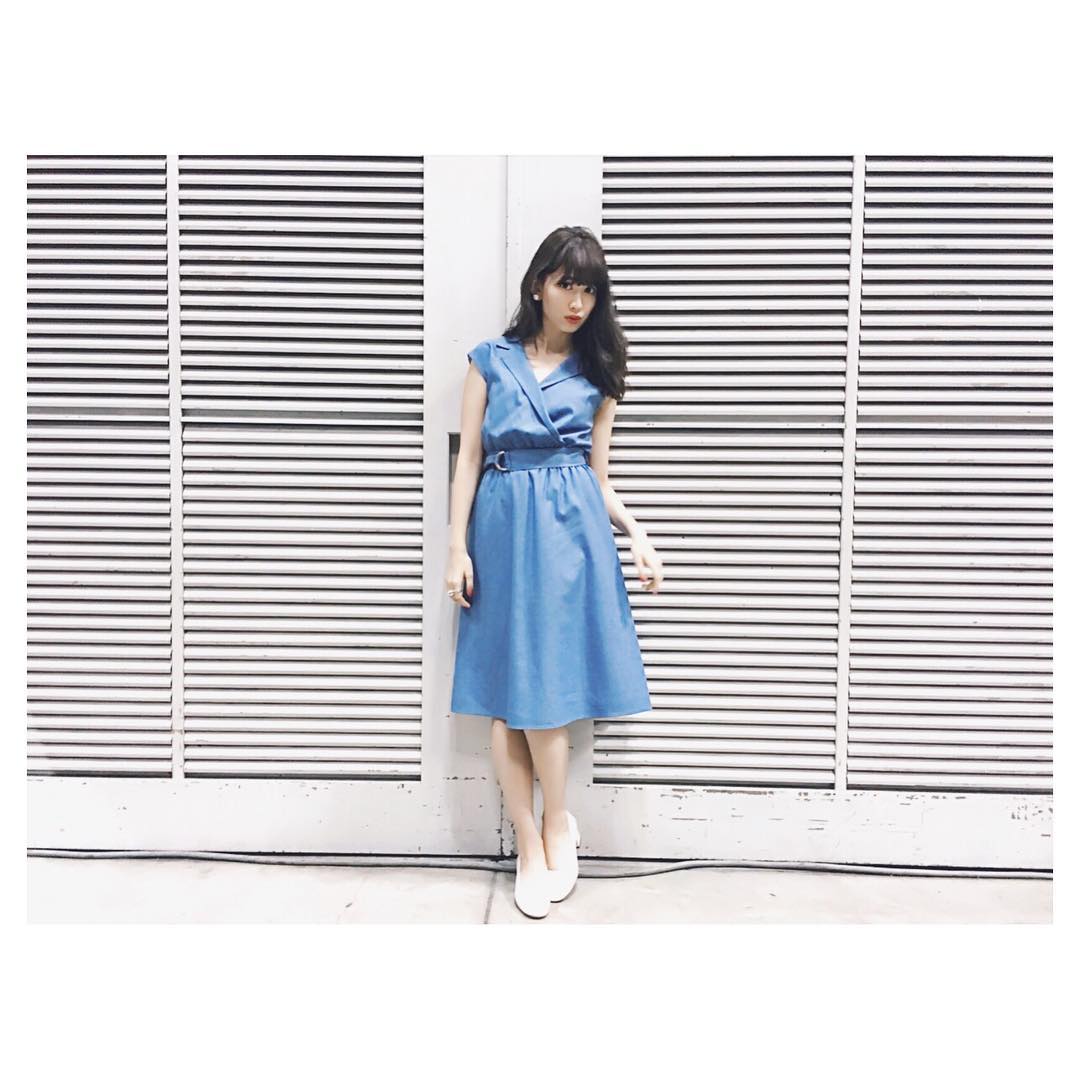 こんなかんじ💙 ミディ丈だから上品で、 ウエストマークがスタイルアップしてくれるの。襟もちょうどいい開きでデコルテを綺麗にみせてくれるからおすすめ😊💋 #mercuryduo #sweet #haruna_kojima#kojiharunyan#kojima_haruna#小嶋陽菜Haruna KojimaKojima HarunaMERCURYDUOnyanchan22sweet