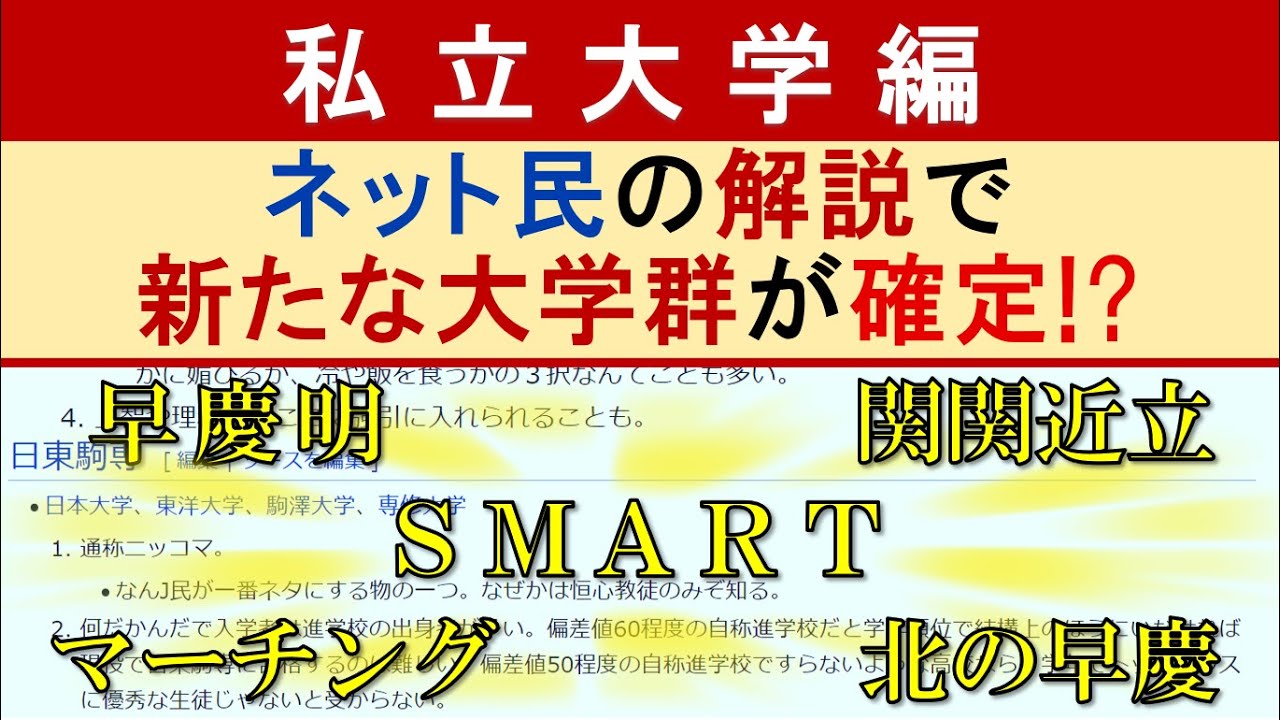 【私立編】ネット民の解説で新たな大学群が確定!?【早慶明・SMART・関関近立・マーチング・MARCH・産近甲龍・日東駒専・関東上流江戸桜】