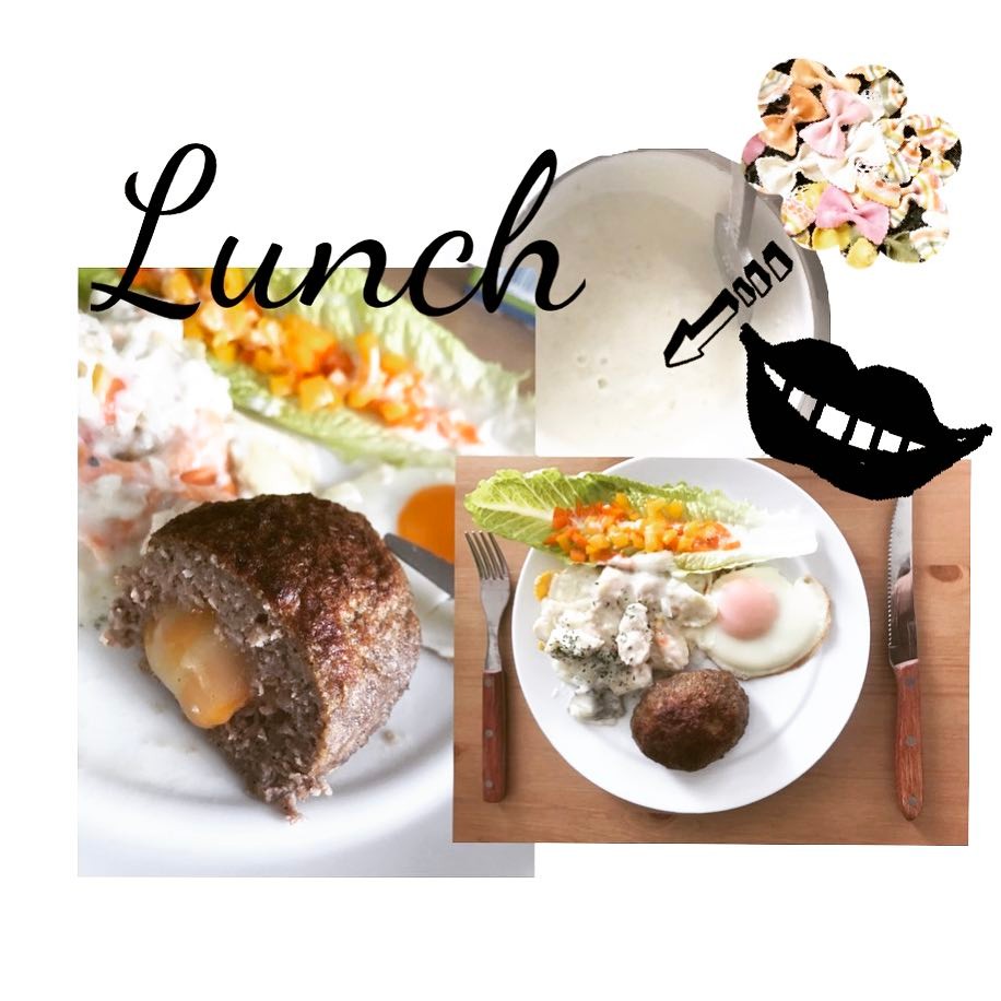 Lunch ロメインレタスとカラーピーマンのシーザーサラダ 牛肉100パーセントチーズインハンバーグ(台所の魚焼き器でじっくり焼き) リボンパスタとチキンのゴルゴンゾーラソース ソースは玉ねぎみじん切りをバターで炒め米粉で絡めて白ばら牛肉✨残っていたブルーチーズをとかして。 目玉焼き #ぱいるめし #チーズ はおつまみチーズで小さく小分けにされてるチーズが余ってたので、包んでみました #ワンプレートランチ #eriko_hori#Pile#堀絵梨子Eriko HoriHori Erikoチーズぱいるめしワンプレートランチ