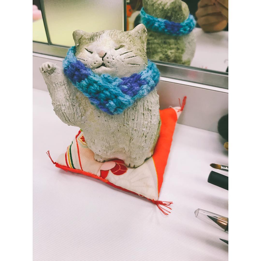 私の化粧前にいる、この猫ちゃん。招き猫太郎と言います。今日来たらなんと、冬仕様に!結髪のフミさんがマフラーをつけてくださったんです😎