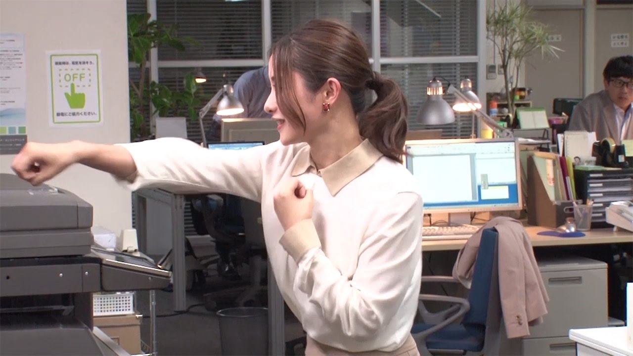 The video starts with the image where Ishihara is copying documents with a tiring face, then she suddenly does “strong” boxing on high heels, and followed by jabs, consecutive punches, or hooks from the bottom up.