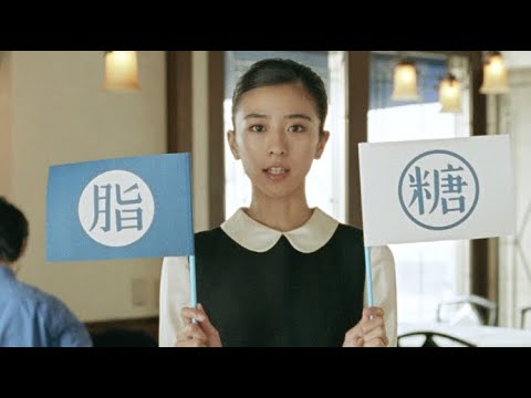 洋食レストランを舞台に、レトロなコスチュームが似合うウェイトレスの黒島が、出来上がった料理をお客様である玉山のテーブルに運ぶところからスタート。糖質制限中の玉山がオーダーしたのはサーロインステーキと少な目のライス。バターをつけたステーキを頬ばる玉山さんの後ろで、黒島が「糖」と「脂」と記された手旗を上げ下げしながら「糖避けて、脂避けない」と 歌いだすユーモラスな内容になっている。