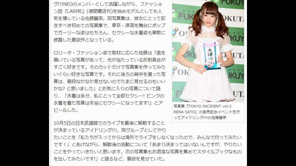 アイドルグループ、アイドリング!!!の佐藤麗奈が27日、東京・新宿の福家書店 新宿サブナード店で写真集『TOKYO INCIDENT vol.3 RENA SATO』(発売中 2,138円税込 ワニブックス刊)の発売記念イベントを行った。女性アイドルグループ、アイドリング!!!とアイドリング!!!NEOのメンバーとして活躍しながら、ファッション誌『LARME』(徳間書店刊)を始めモデルとしても人気を博している佐藤麗奈。同写真集は、彼女にとって記念すべき初めての写真集で、東京・原宿を舞台にポップでガーリーな姿はもちろん、セクシーな水着姿も果敢に披露した意欲作となっている。