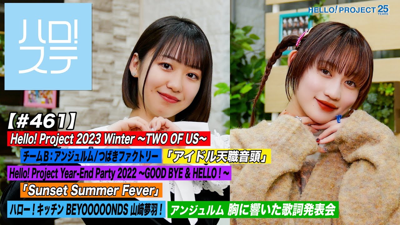 Hello! Project 2023 Winter ~TWO OF US~から チームB アンジュルム&つばきファクトリーの「アイドル天職音頭」!さらに Hello! Project Year-End Party 2022 ~GOOD BYE & HELLO ! ~ モーニング娘。’22 プレミアム から「Sunset Summer Fever」のパフォーマンス映像をお届け!ハロー!キッチンは山﨑夢羽が「手まり寿司」に挑戦中!「胸に響いた歌詞発表会」は アンジュルム のメンバーがあの曲を紹介します!MCはモーニング娘。’23 野中美希とアンジュルム 佐々木莉佳子!