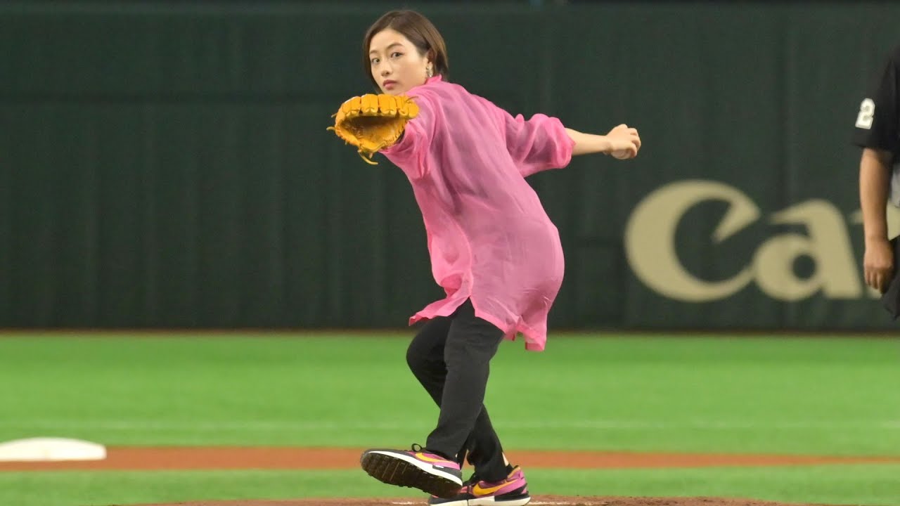 石原さとみ、今年は斎藤雅樹の代名詞“サイドスロー投法” ノーバンならず悔し顔 『サントリー ドリームマッチ 2021』始球式