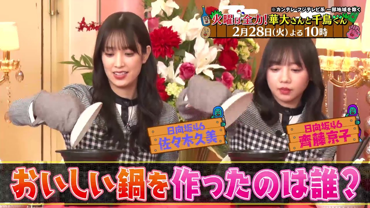 2月28日(火)の放送は、大好評企画・料理6連単!テーマは『おいしい鍋』。華大千鳥かまいたちの6人がそれぞれこだわりの鍋を作り、日向坂46の佐々木久美&齊藤京子がおいしかった順にランク付け!6人は日向坂46の2人のランキングを予想し賞金獲得を目指す。見事ランキングを的中させ賞金獲得なるか!?