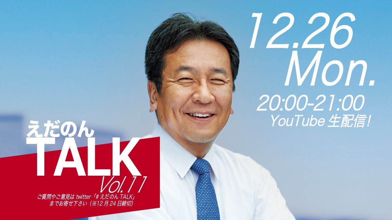 多くの皆さんに、YouTube枝野幸男チャンネルの登録と、「えだのんTALK」のご視聴、#えだのんTALK への投稿をいただきますよう、お願いいたします。