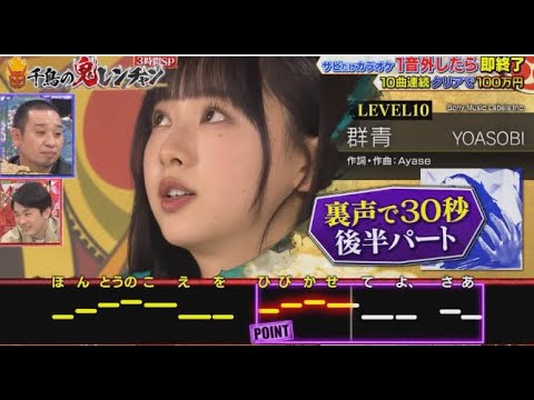 今回は、丘みどり、松浦航大、Mr.シャチホコ、ROYALcomfort・KAY-I、日向坂46・富田鈴花、りんごちゃんら各界の歌の実力者たちが登場!人気曲のサビだけを一音も外さずに10曲連続で歌い切れたら賞金100万円を獲得できる人気コーナー「サビだけカラオケ」に挑戦し、リベンジを誓う猛者たちの熱唱ステージが繰り広げられる。