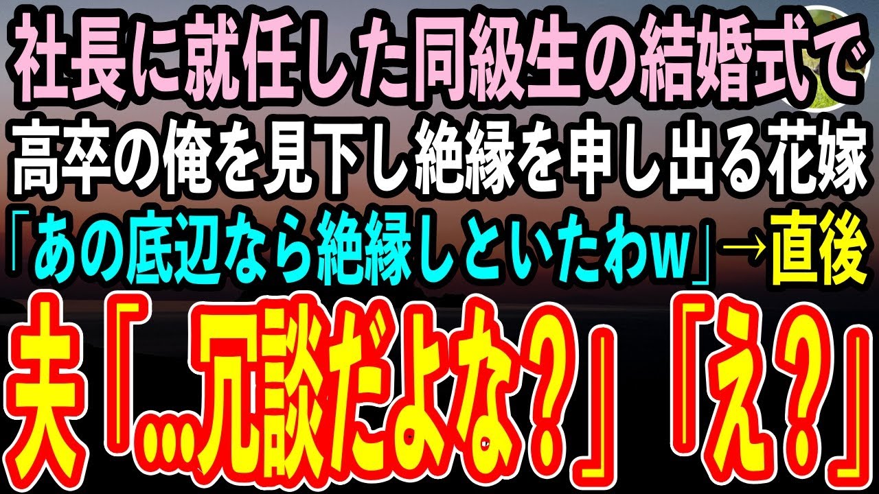 【感動する話】30代で社長に就任したエリート同級生の結婚式で、高卒の俺を見下す花嫁「低学歴の社会のゴミは夫と縁を切ってくれる?」→挙式後、夫は顔面蒼白「…今なんて言った?」花嫁「え?」【スカッと朗読】