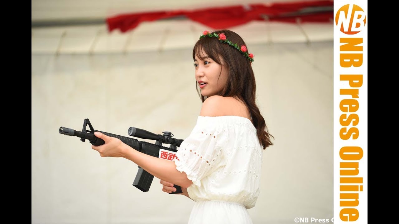 モデルガンが好きで、銃砲所持許可証も持つ永尾まりやさんらしく、水鉄砲をさすがの構えで集まった来場者に向けて発射していました。