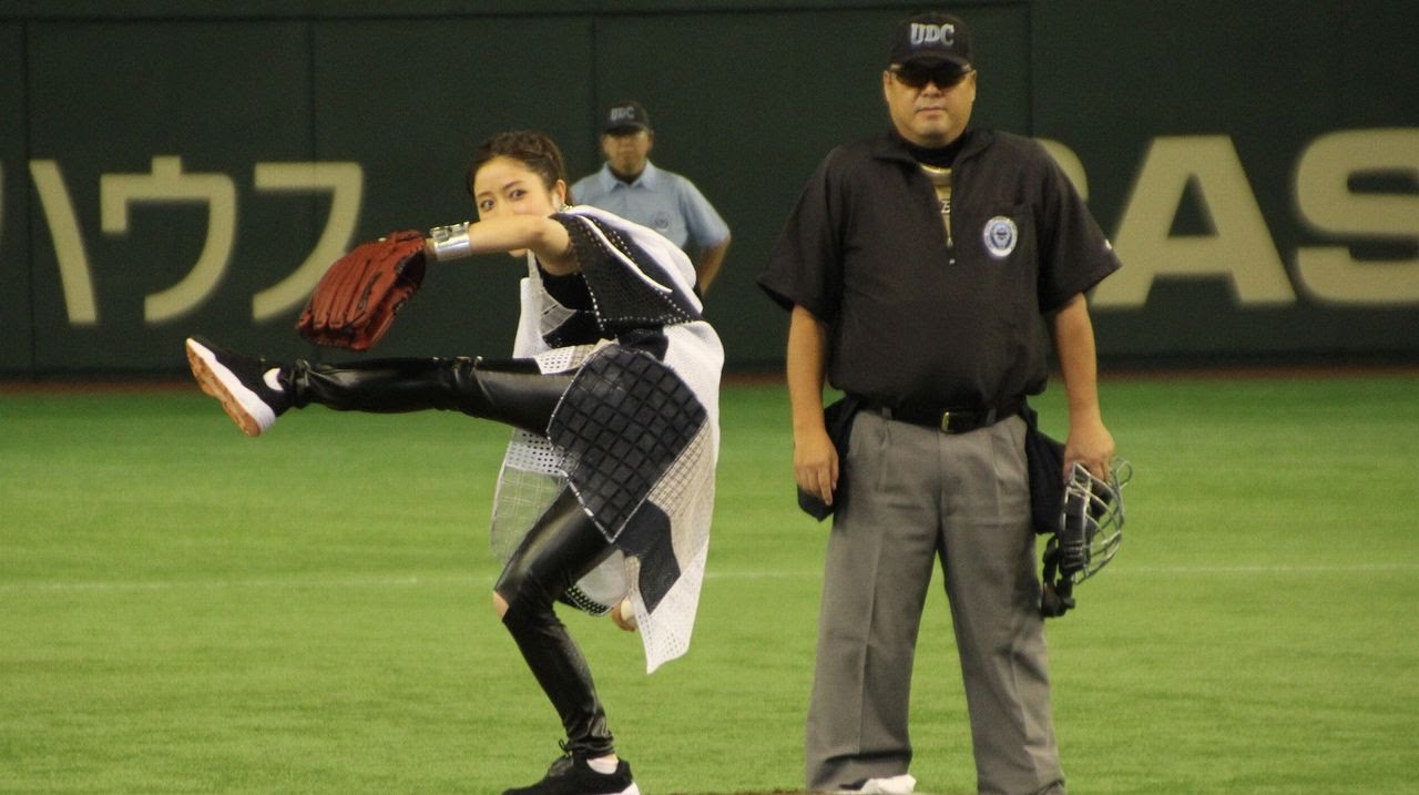 Actress Satomi Ishihara attended the opening ceremony of the baseball match “Suntory Dream Match 2015” in Tokyo Dome (Bunkyo, Tokyo) on August 3rd. She delivered a pitch in the axe-throwing style with left foot elevated, when the perfect non-bouncing ball hit the catcher’s mitt, she kept pumping her fist in exuberance.