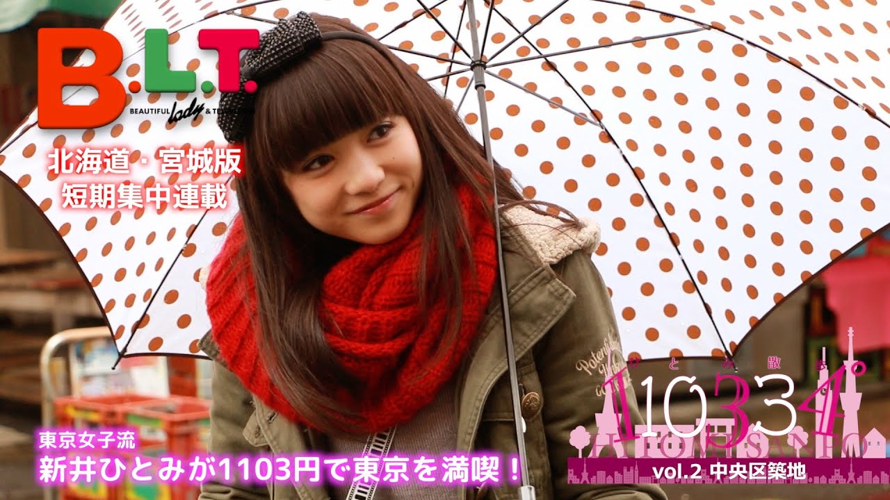 テレビ情報誌「B.L.T.」 <北海道・宮城版>に掲載中の、東京女子流・新井ひとみの短期集中連載「110334゜(ひとみ散歩)」。”ひとみ”にちなみ、お小遣い1,103円を持って、東京の町をお散歩します。2015年4月号(2月24日発売)の連載第2回では”東京の台所”、築地へ!