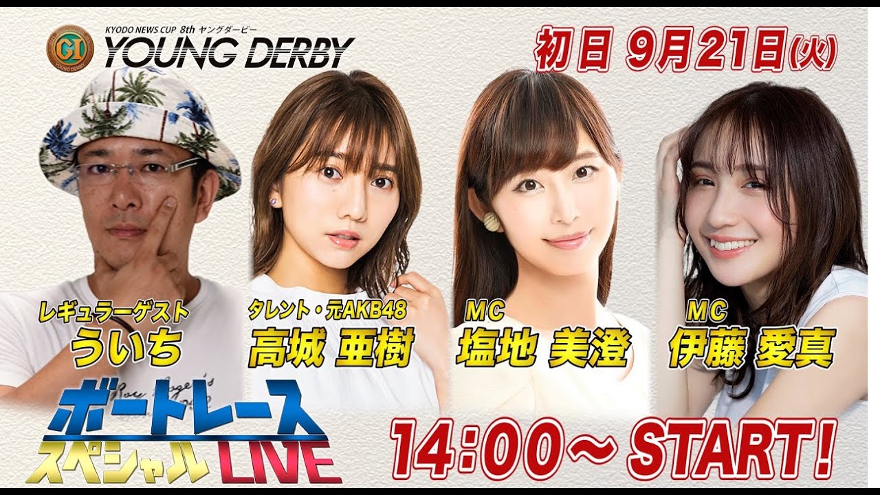 ボートレース|元AKB 高城亜樹がスペシャルLIVEに初登場!|9月21日(火)14:00~|徳山プレミアムGⅠ第8回ヤングダービー初日8R~12R|ボートレーススペシャルLIVE