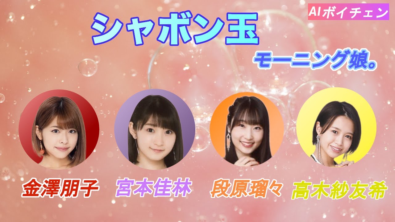AI音声合成技術を使って、#高木紗友希 #宮本佳林 #金澤朋子 #段原瑠々(元&現 #juicejuice )が #モーニング娘。の19hシングル「シャボン玉」を歌ってみた動画です。