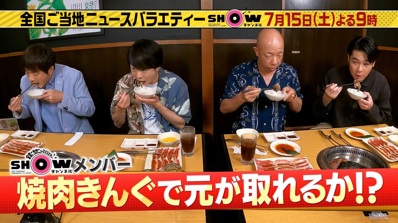 「SHOWチャンネル」7月15日土曜よる9時!焼肉きんぐ食べ放題に櫻井&羽鳥&小峠&吉村が挑戦▼ご当地ヘッドラインは栃木編!なにわ男子藤原&道枝が日本一貧乏!?な宇都宮動物園に潜入