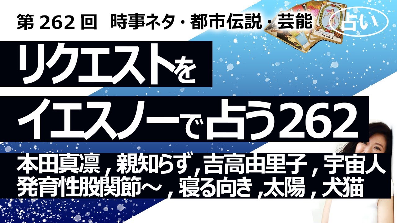 【262回目】イエスノーでリクエストを占うコーナー……本田真凛、親知らず、吉高由里子、宇宙人会話、発育性股関節形成不全、矯正、寝る向き、太陽人工物、犬猫【占い】(2023/8/14撮影)https://youtu.be/nJr2aROPZ18