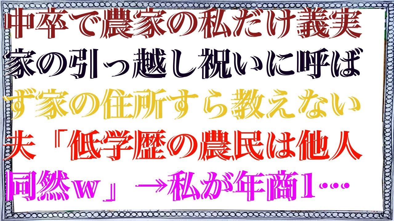 【スカッとする話】 中卒で農家の私だけ義実家の引っ越し祝いに呼ばず家の住所すら教えない夫「低学歴の農民は他人同然w」→私が年商10億の社長になった途端、手のヒラ返しされたので他人設定を貫いた結果【…