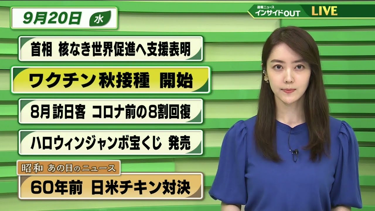 【今日のニュース 9月20日】 「首相 核なき世界促進へ支援表明」「ワクチン秋接種開始」「8月訪日客 コロナ前の8割回復」「ハロウィンジャンボ宝くじ 発売」「昭和あの日のニュース・ 日米チキン対決」