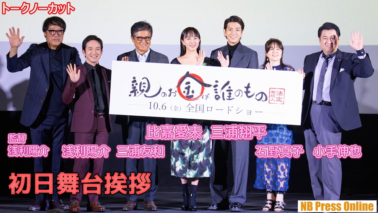 2023年10月6日、シネマート新宿にて、映画『親のお金は誰のもの 法定相続人』初日舞台挨拶が行われ、W主演の比嘉愛未と三浦翔平、そして、浅利陽介、小手伸也、石野真子、三浦友和、さらに田中光敏監督が登壇。自身の役どころや共演者の印象、伊勢志摩の美しい景色の元、撮影された本作についての魅力を語った。
