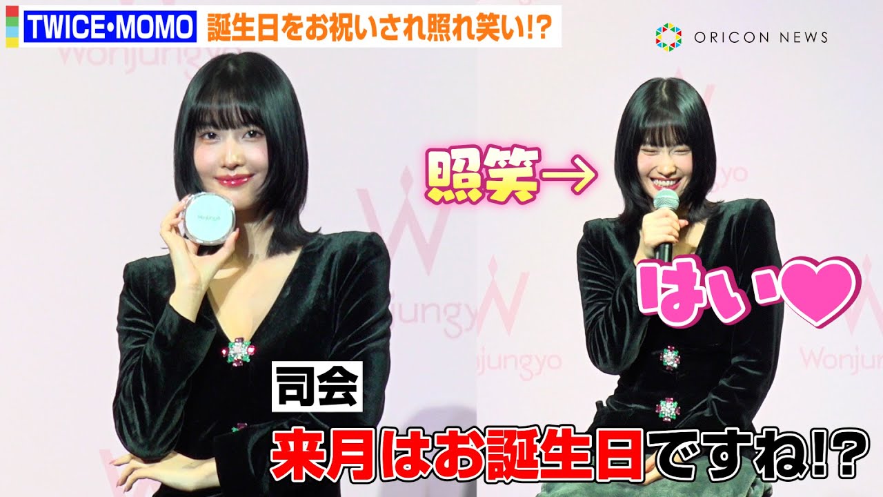 TWICE・MOMO、誕生日をお祝いされキュートな照れ笑い!?胸元ざっくり&美脚あらわなタイトワンピースで『Wonjungyo』誕生1周年をお祝い 『Wonjungyo』誕生1周年記念記者発表会
