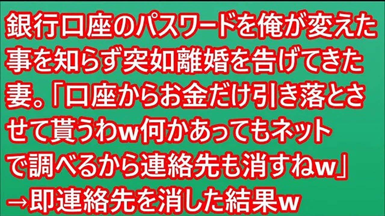 【スカッと】銀行口座のパスワードを俺が変えた事を知らず突如離婚を告げてきた妻。「口座からお金だけ引き落とさせて貰うわw何かあってもネットで調べるから連絡先も消すねw」→即連絡先を消した結果w