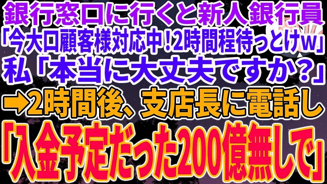 【スカッとする話】銀行窓口に行くと新人銀行員「今大口顧客様対応中!2時間程待っとけw」私「本当に大丈夫ですか?」→2時間後、支店長に電話し「入金た200億円間に合わなかったので無しで」「