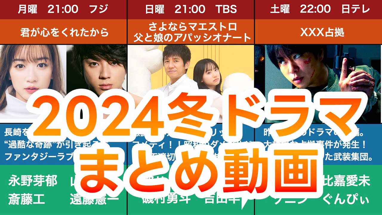 【冬ドラマ/曜日別】2024年冬ドラマ新ドラマ1月期まとめ 君が心をくれたから グレイトギフト マルス 不適切にもほどがある おっさんずラブ XXX占拠 光る君へ さよならマエストロ