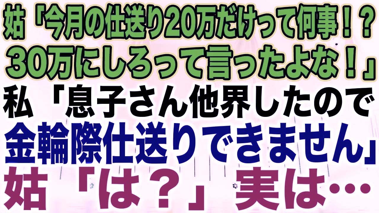 姑「今月の仕送り20万だけって何事!?30万にしろって言ったよな!」私「息子さん他界したので金輪際仕送りできません」姑「は?」実は…