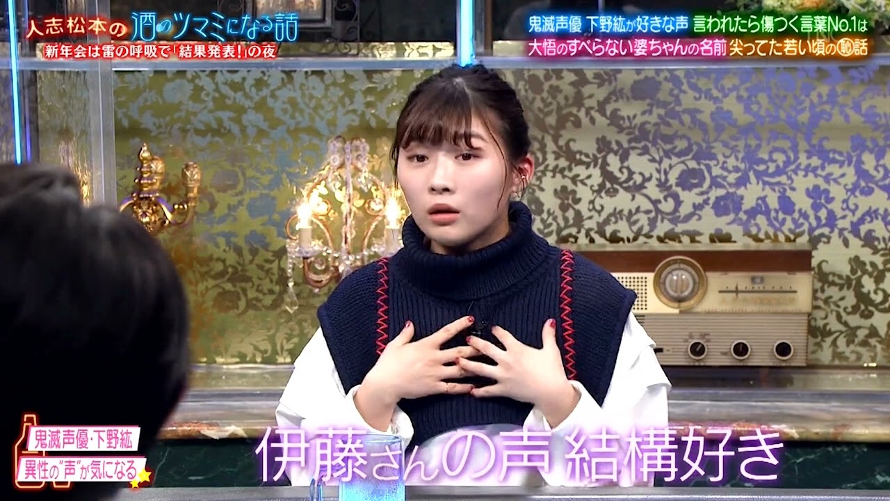 『人志松本の酒のツマミになる話』BGM 鬼滅の刃声優下野紘が好きな声…伊藤沙莉&武田真治がつい買っちゃうもの…チョコプラ松尾異性に言われて一番傷つく言葉…パンにジャムはいらない?にノブ激怒!